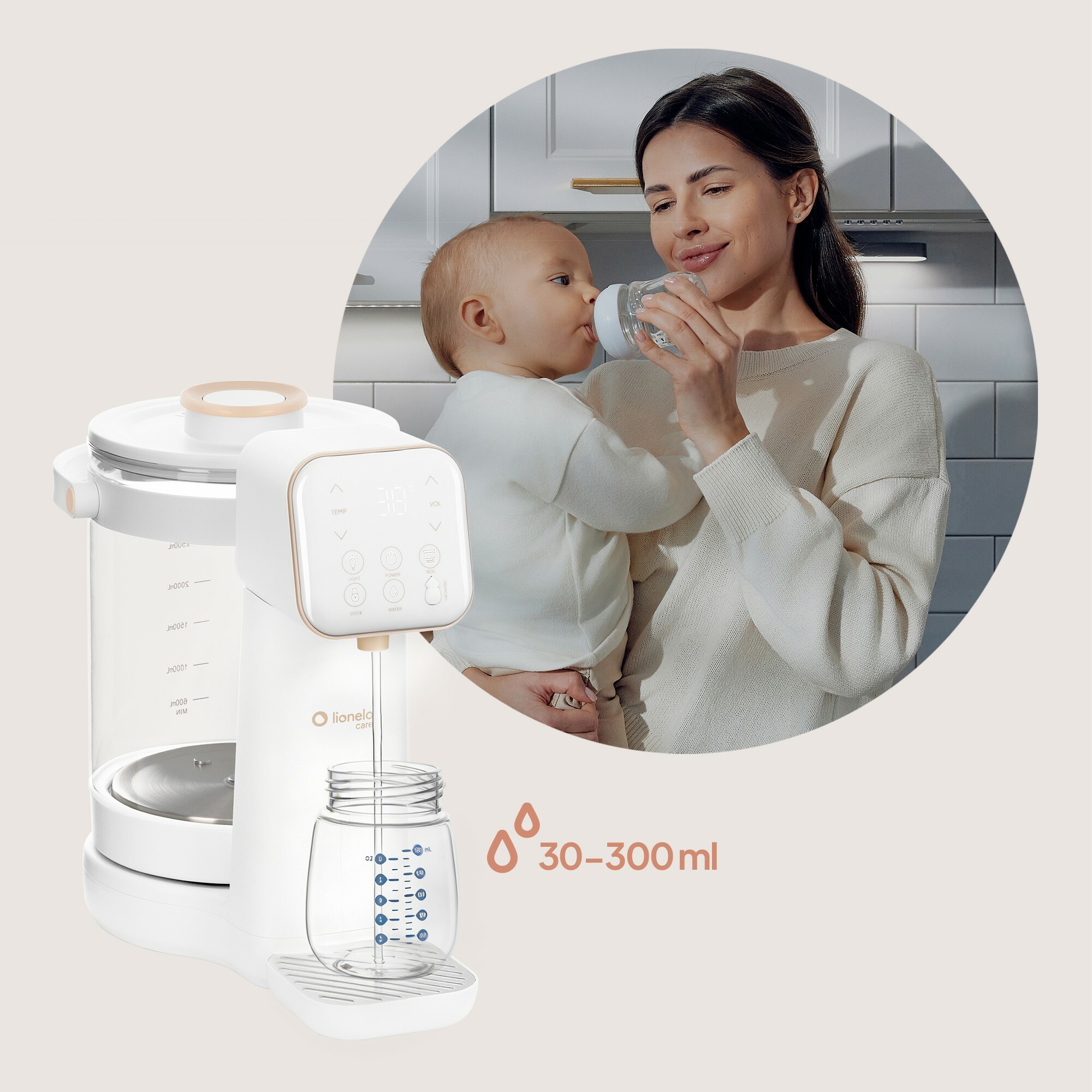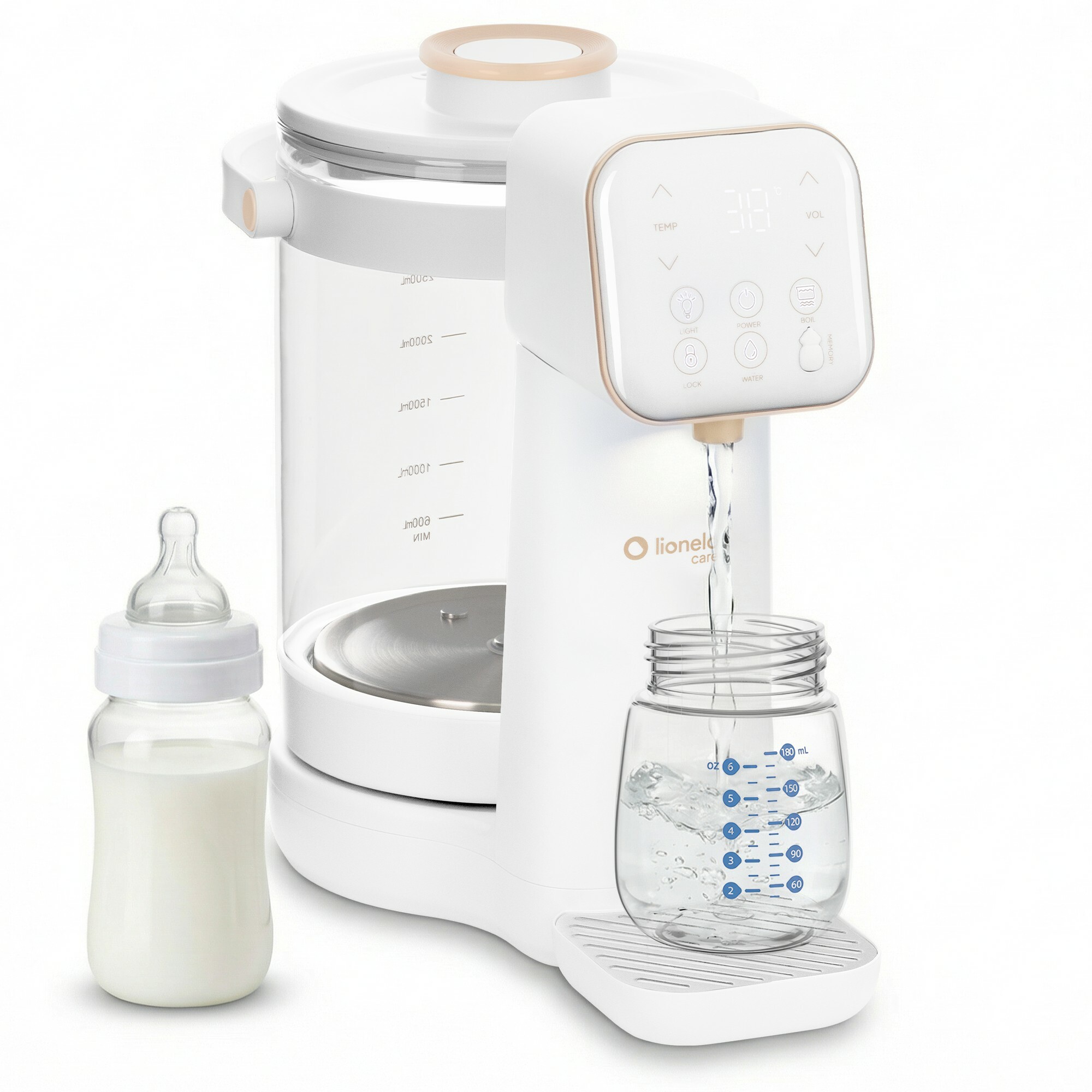 Aparat pentru incalzirea si declorizare apei, Lionelo, Babypresto 2.0, Pentru lapte parf, Lampa UV, Rezervor 3l, Lumina de noapte, Dozare 30- 300 ml, 1200 W, Afisaj digital, Alb