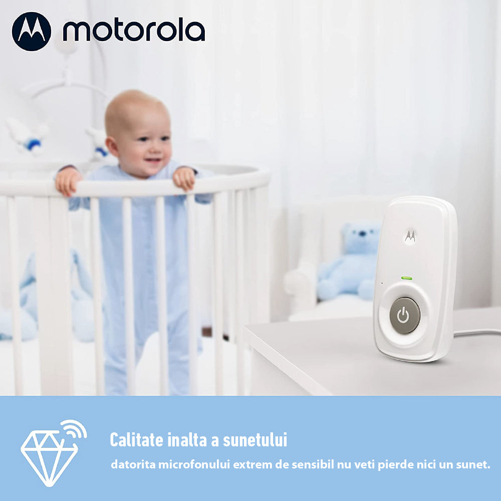 Noul Motorola AM24 face parte din noua generatie de Audio Monitoare Digitale ce utilizeaza tehnologia moderna DECT, care nu interfereaza cu frecventa Wi-Fi de acasa. Acest Audio Monitor Digital Motorola AM24 va permite sa vegheati bebelusul in timp ce doarme intr-o alta incapere. Este dotat cu un microfon extrem de sensibil, datorita caruia puteti auzi fiecare sunet al copilului, iar raza sa de actiune este de pana la 300 de metri in camp deschis. Audio Monitorul AM21 intra in regim de asteptare in timp ce copilul doarme si porneste automat imediat ce bebelusul se face auzit prin zgomote.