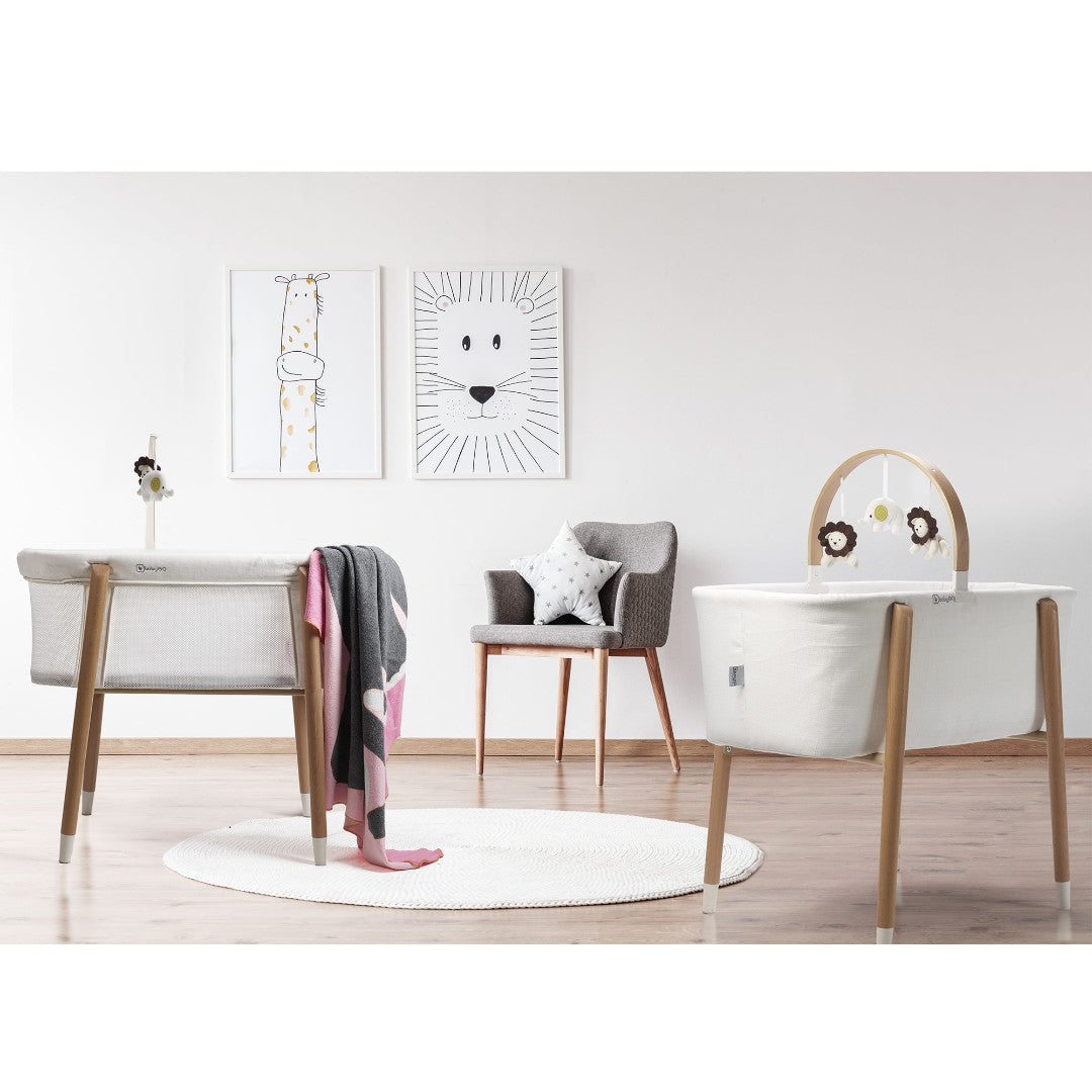 Are o nuanta naturala cu tesaturi albe ce ajuta la linistirea bebelusului.