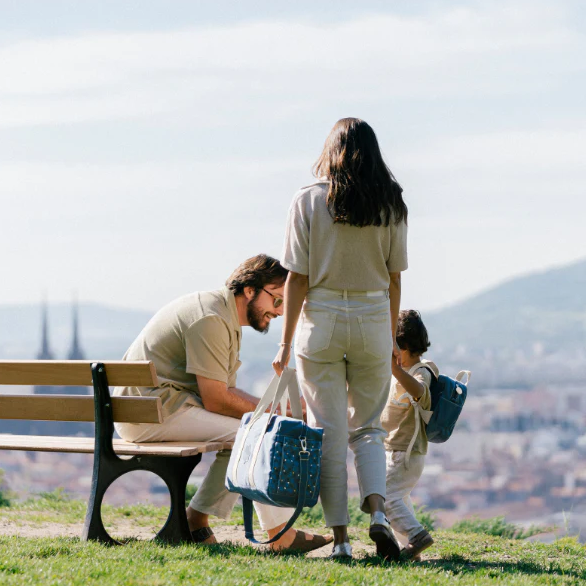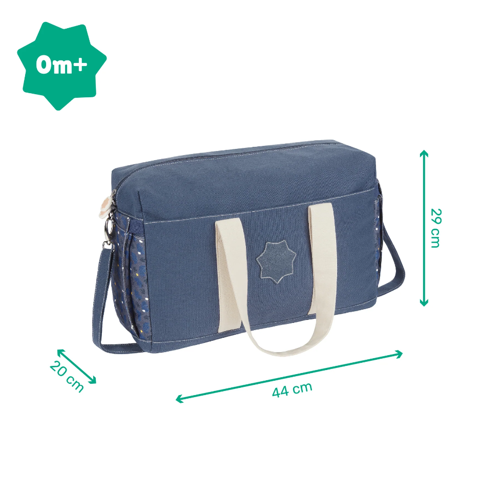 Geanta de scutece in stil bowling din velur are o capacitate mare si poate fi purtata pe umar, ca si accesoriu la carucior iar salteluta de infasat inclusa este ideala in calatoriile impreuna cu cel mic.