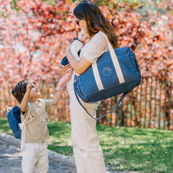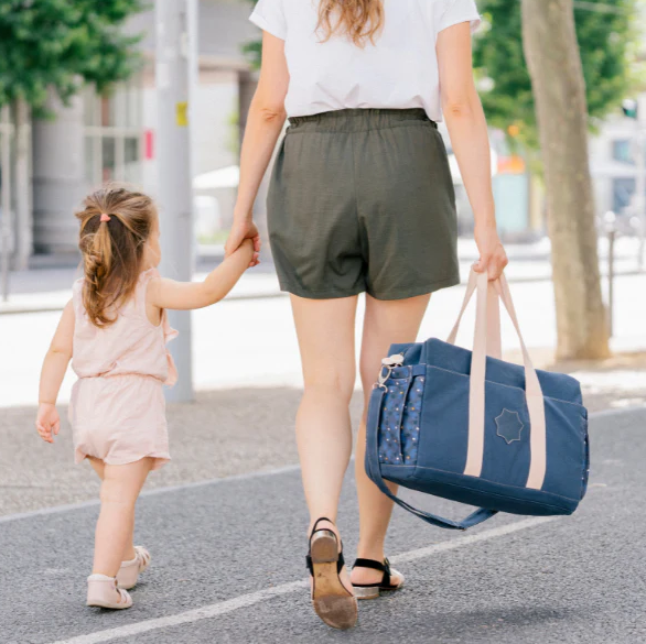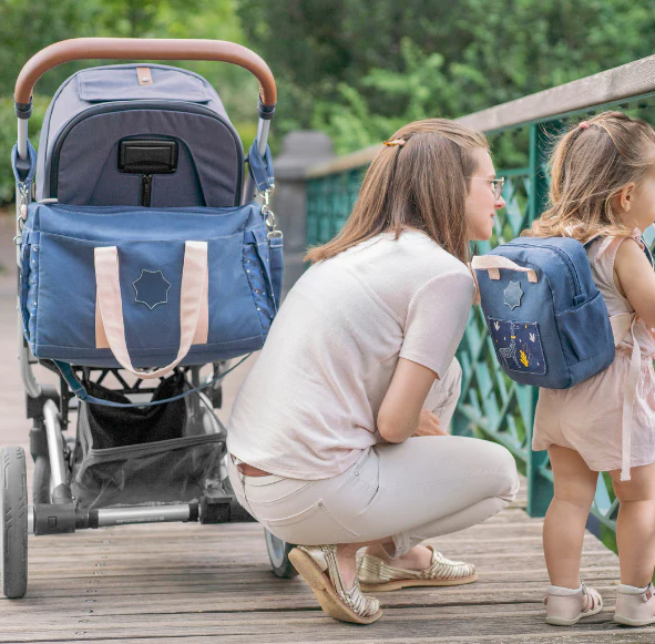 Se poate purta in mai multe moduri: in mana, pe umar, peste corp sau pe carucior (clemele pentru carucior sunt incluse)