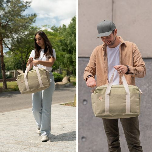 Versatilitate in purtare: Se poate purta pe umar, in mana sau atasata de carucior cu ajutorul celor 2 clipsuri incluse.