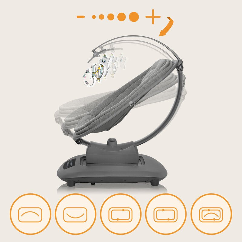 Datorita telecomenzii incluse, puteti controla de la distanta balansoarul – schimbati viteza, volumul, modul de balansare sau porniti sau opriti zgomotul alb, totul fara a va ridica de pe canapea.