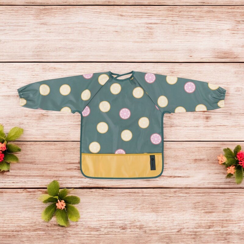- Buzunarul frontal pentru firimituri asigura ordinea si confortul in timpul hranirii, iar manecile lungi cu banda elastica protejeaza hainele de murdarie si umezeala.