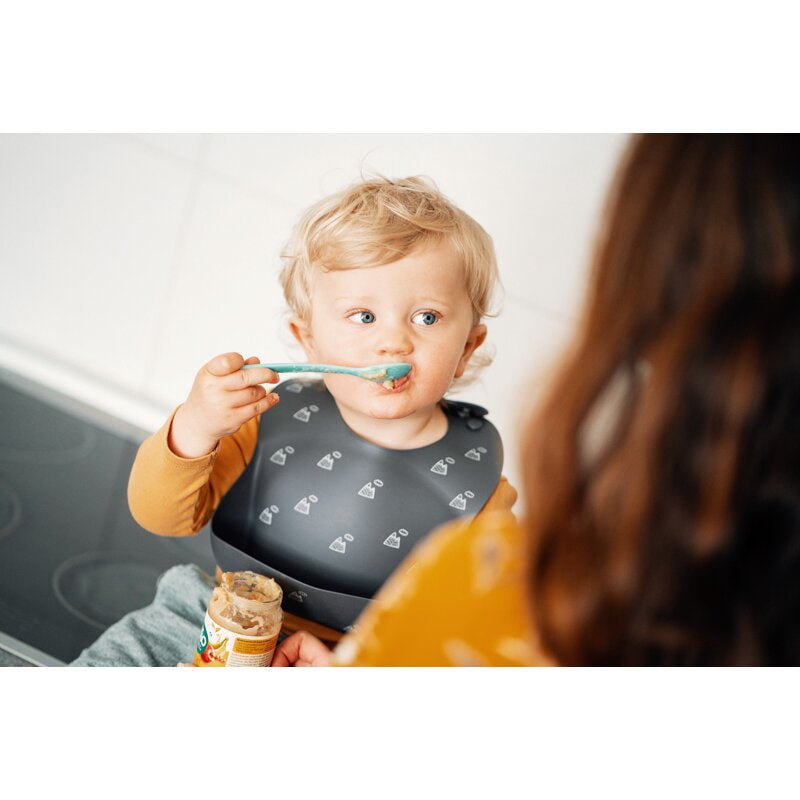 - Este o baveta din silicon confortabil, cu un buzunar practic pentru a tine mancarea.