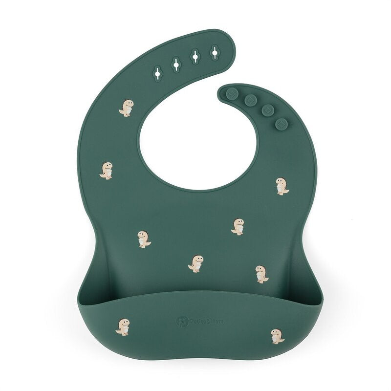 Baveta moale, Petite&Mars, Take&Match, Reglabil, Cu buzunar colector, Silicon, Fara BPA, 6 luni+, Model dinozauri, Verde