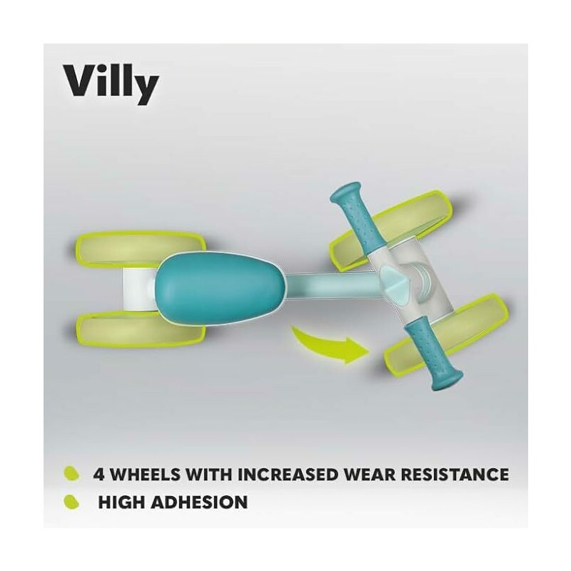 ✔️ Stim cat de important este sa asiguram siguranta copilului atunci cand se distreaza! Acesta este motivul pentru care Villy a fost creat astfel incat sa nu se intample nimic copilului dumneavoastra in timp ce se joaca, iar cadrul sau este conceput in armonie cu trupul celui mic. Bicicleta este complet stabila datorita celor patru roti si amortizarii din furca fata. Tractiune excelenta este garantata de roti realizate dintr-o combinatie de spuma EVA si plastic TPR . Bicicleta este echipata si cu blocare a directiei.