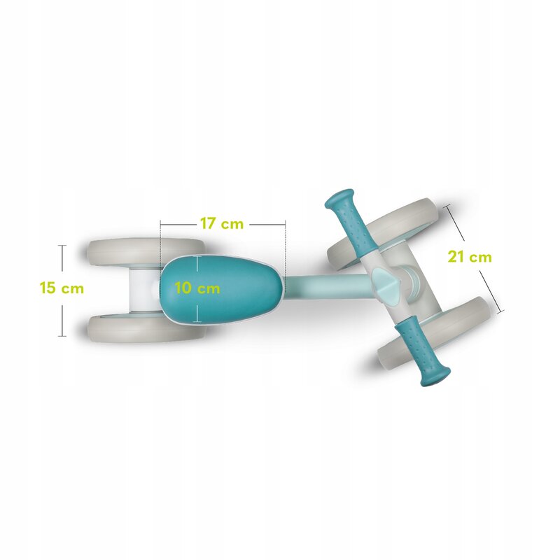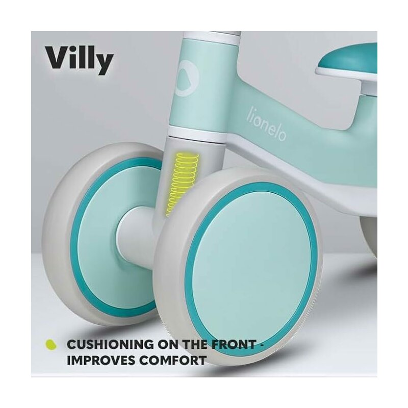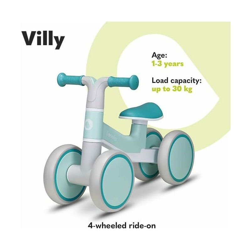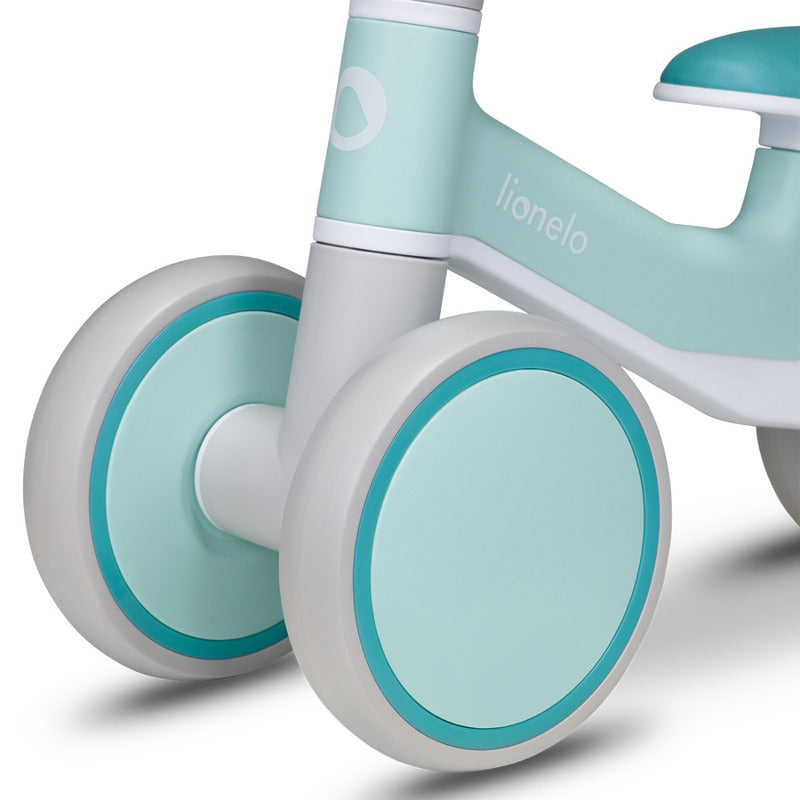 Bicicleta fara pedale, Lionelo, Villy, Cu 4 roti, Din spuma EVA si TPR, Stabila, Manere moi, antiderapante, 12- 36 luni, Sustine pana la 30 kg, Certificata EN 71-1:2014, EN 71-2:2011, EN 71-3:2019, Verde turcoaz