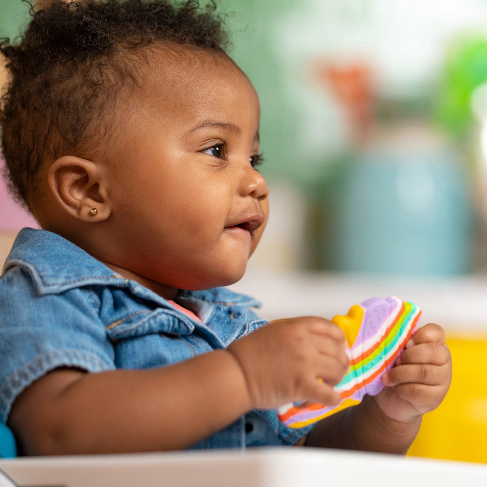 Jucaria de dentitie Bright Starts Soothing Soft Serve este realizata din silicon moale, non-toxic si fara BPA, conceputa special pentru a calma gingiile sensibile ale bebelusului in timpul eruptiei dentare.