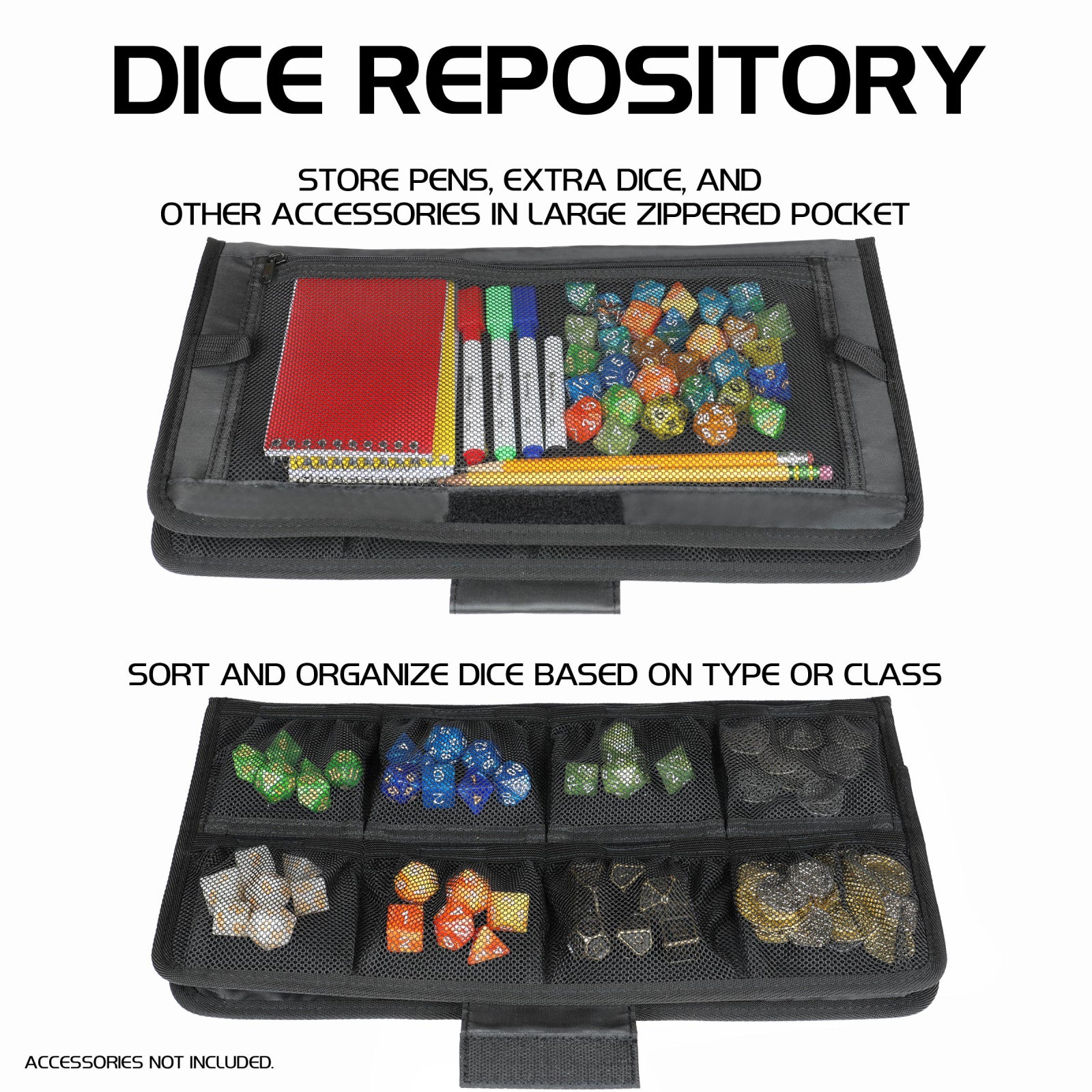- REPOZITORIU DE ZARURI: Organizator detasabil cu 8 buzunare mici si un buzunar mare cu fermoar pentru a sorta pana la 150+ zaruri in functie de tip; poate tine si alte accesorii, cum ar fi jetoane, creioane si carnetele.