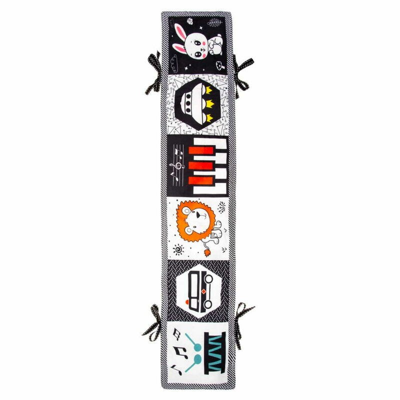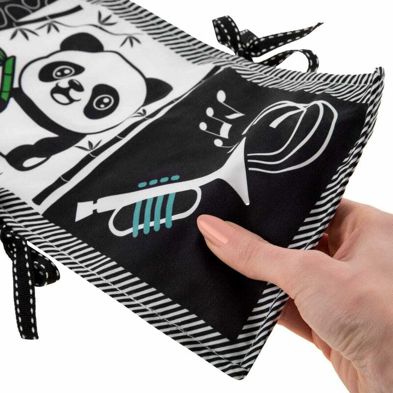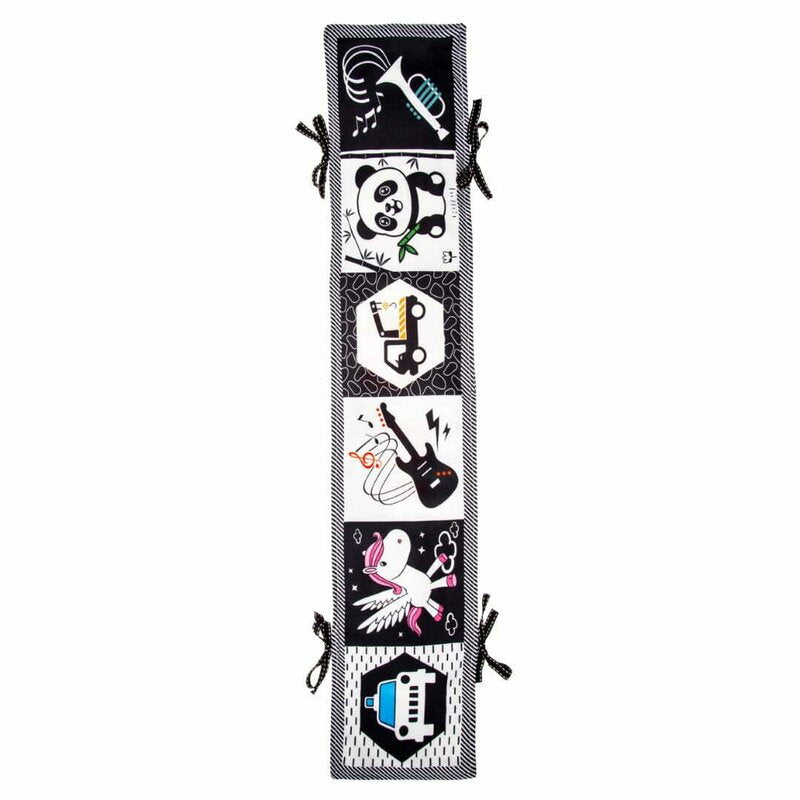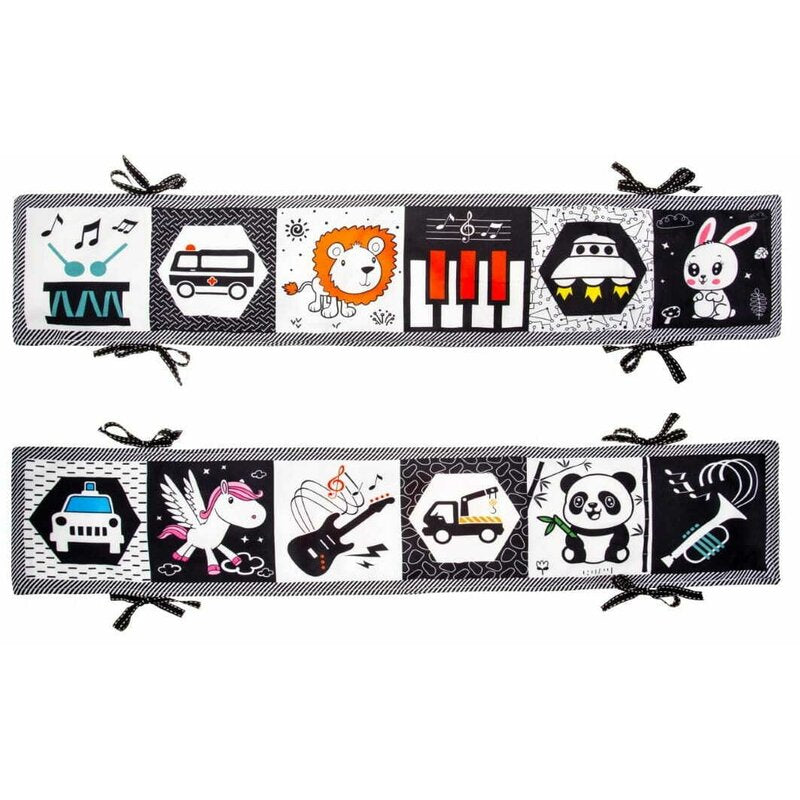 Carticica senzoriala, Bocioland, Cu 12 imagini contrastante, Fosneste cand este atinsa, Cu panglici pentru atasare la patut, 15x80,5 cm, 0 luni+, Rabbit