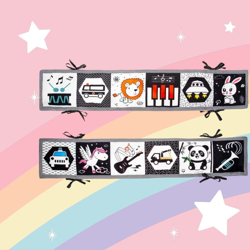 Stimulare senzoriala – cele 12 imagini contrastante alb-negru si color stimuleaza perceptia vizuala si concentrarea, contribuind la dezvoltarea cognitiva timpurie.