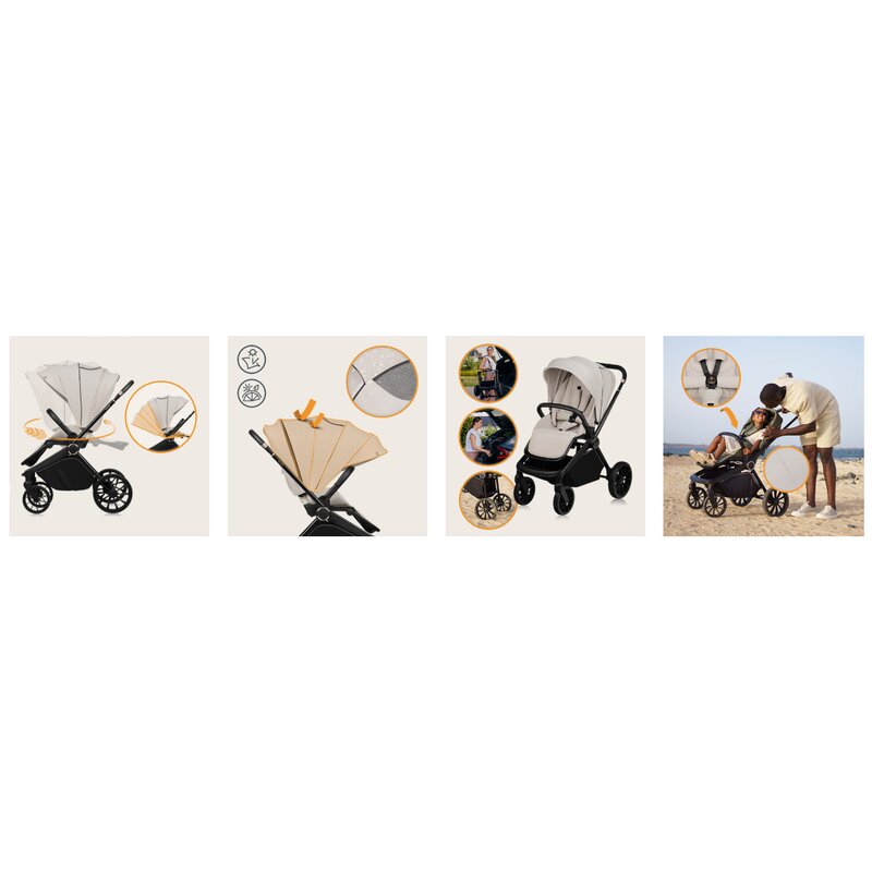 Copertina caruciorului, atat pentru landou cat si pentru varianta sport, este echipata cu filtru UPF50+ si un strat rezistent la apa. Copertina larga protejeaza copilul de conditiile meteo si de stimulii excesivi. Panoul de ventilatie extensibil din copertina si sistemul de ventilatie asigura un mediu placut pentru copil.