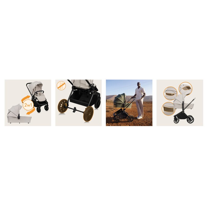 - Rotile compatibile cu toate terenurile sunt ideale atat in oras, cat si pe teren accidentat, ceea ce face caruciorul potrivit pentru orice excursie, indiferent de conditii.