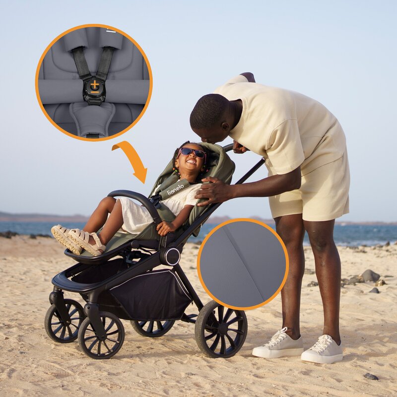 Materialele folosite sunt de cea mai inalta calitate datorita continutului ridicat de elastan, husa nu se sifoneaza, iar tesatura de calitate superioara este rezistenta la uzura si conditii meteo. Centurile sunt echipate cu o catarama magnetica speciala pentru o fixare usoara, iar adaptoarele incluse permit ajustarea inaltimii landoului in functie de cerintele parintilor.