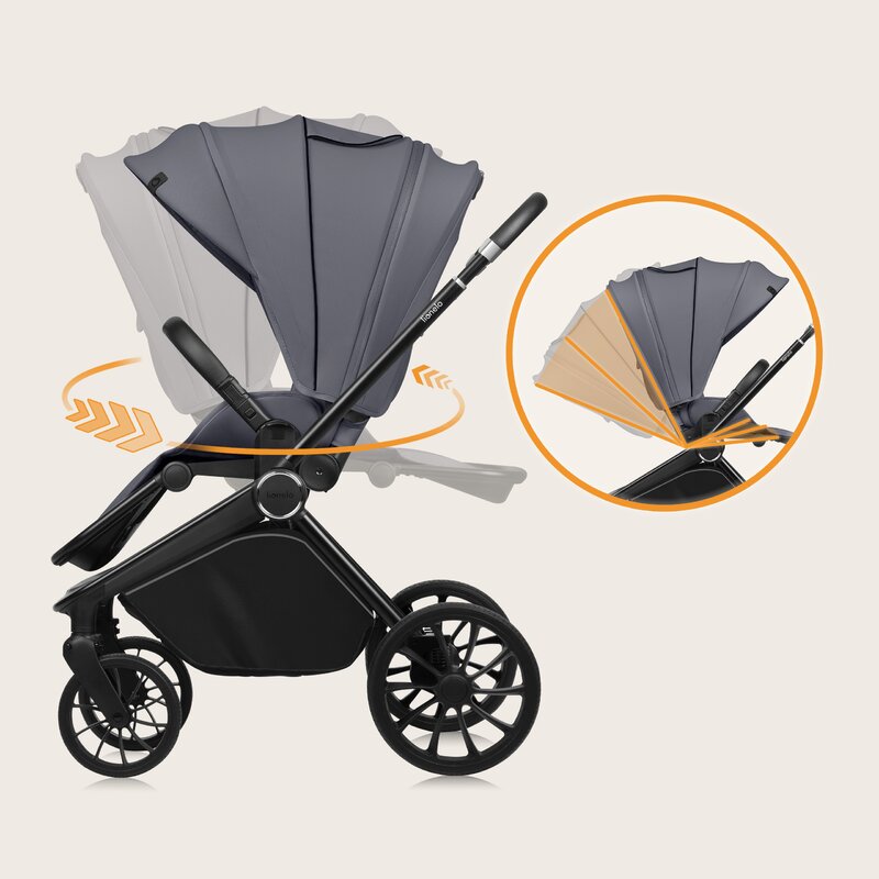Copertina caruciorului, atat pentru landou cat si pentru varianta sport, este echipata cu filtru UPF50+ si un strat rezistent la apa. Copertina larga protejeaza copilul de conditiile meteo si de stimulii excesivi. Panoul de ventilatie extensibil din copertina si sistemul de ventilatie asigura un mediu placut pentru copil.