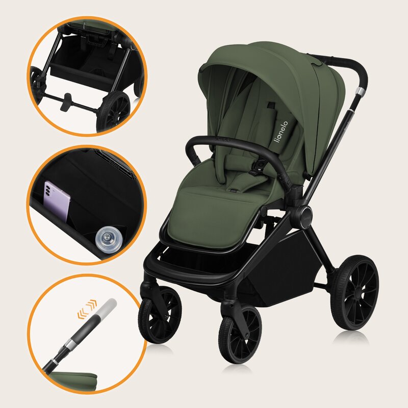 Carucior 3 in 1, Lionelo, Mika Plus, Cadru din aluminiu, Cu landou intarit si salteluta moale, Cu scoica auto testata ADAC, Reversibil, Cu sistem de ventilatie 3D, Cu accesorii, Pana la 22 kg, EN1888-1 EN1888-2 EN1466 ECE R129, Verde