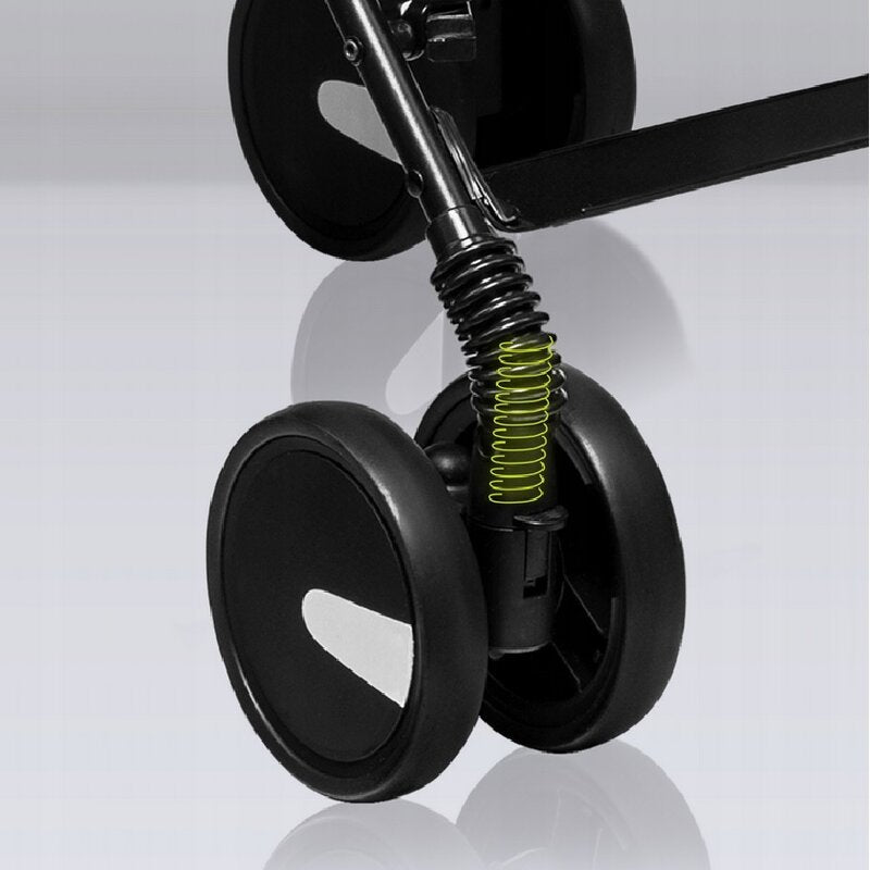 Rotile din spuma EVA sunt rezistente la uzura si nu necesita pompare, oferind o utilizare fara griji. Suspensiile pe rotile din fata asigura o deplasare lina, iar functia de blocare a pivotarii faciliteaza controlul caruciorului pe suprafete dificile sau aglomerate.