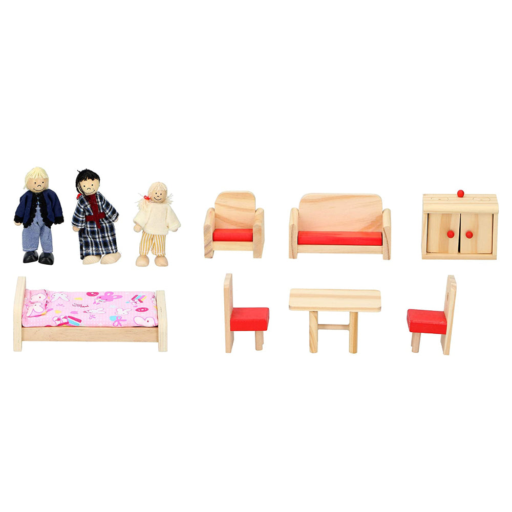 - Set extins de accesorii: 3 figurine (barbat, femeie, copil), 2 scaune, 1 masa, 1 pat, 1 dulap, 1 fotoliu si 1 canapea.