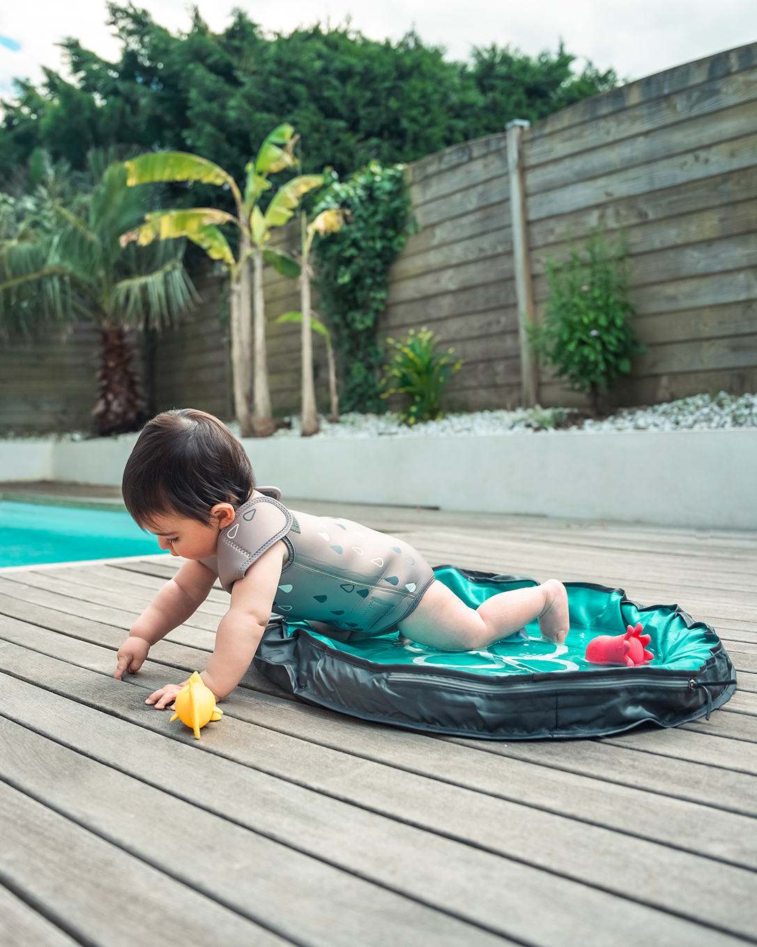Ideal pentru bebelusi curiosi, costumul ofera sustinere graduala si confort termic, incurajand joaca si explorarea in apa.