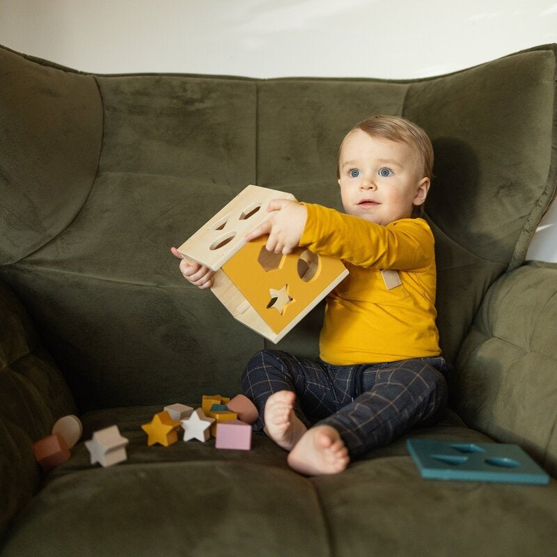 Sortatorul de lemn Gravity dezvolta abilitatile manuale ale copilului, sustinand abilitatile motorii fine, gandirea logica si predarea relatiilor cauza-efect.