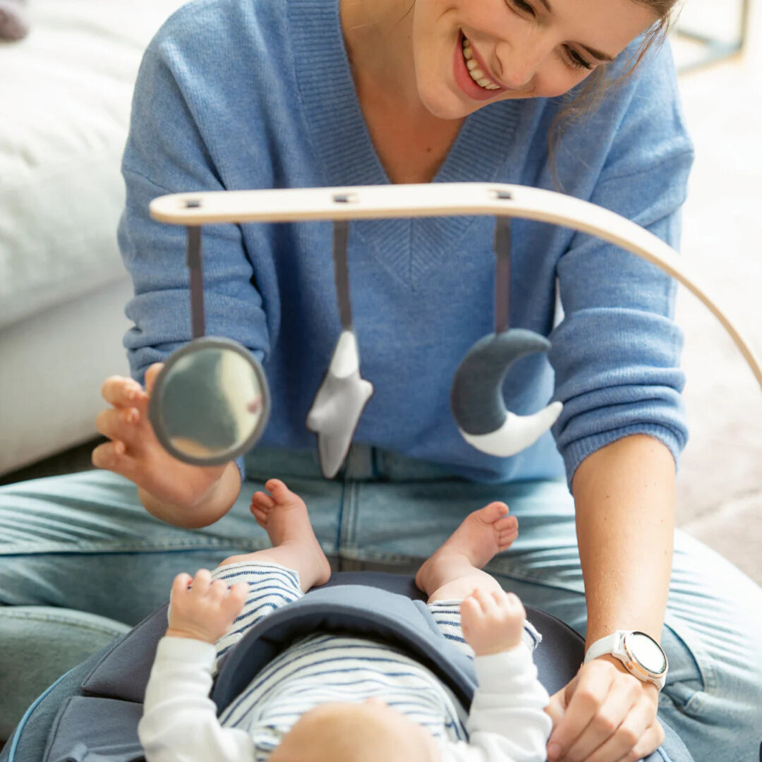 Aceasta bara de jucarii are un design simplu si consta dintr-un brat curbat din lemn si 3 jucarii mobile care sunt reglabile in inaltime datorita inchiderii tip velcro.
