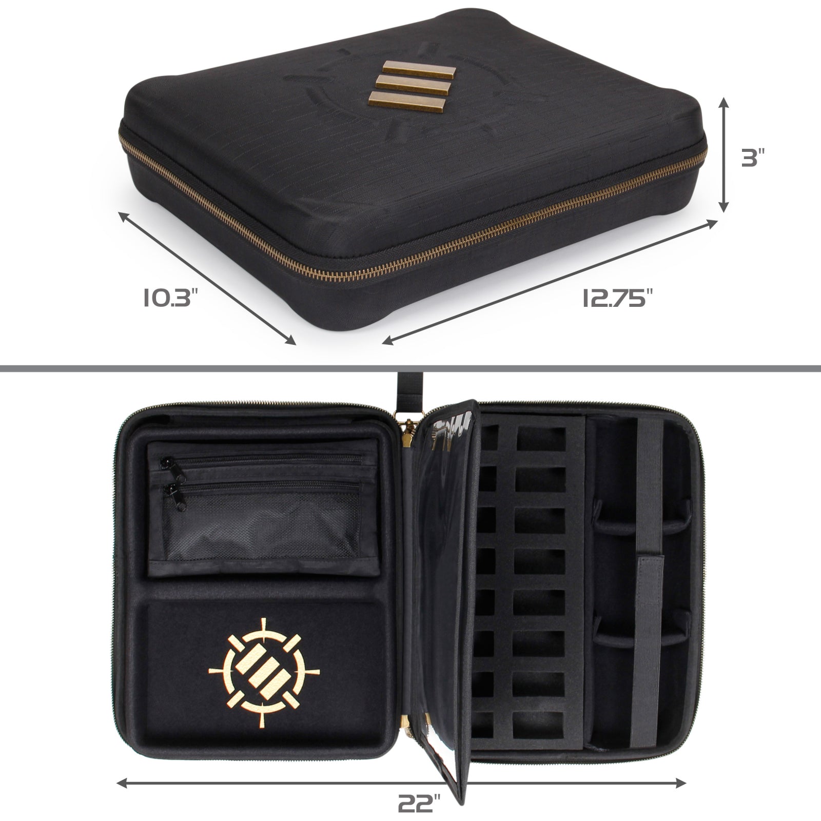 - COMPARTIMENTE PREGATITE PENTRU LUPTA - Panoul din stanga include o zona mare pentru aruncarea zarurilor si un buzunar detasabil cu fermoar pentru pixuri, zaruri si jetoane. Intregul panou se poate ridica pentru a accesa un compartiment suplimentar pentru depozitarea fiselor.