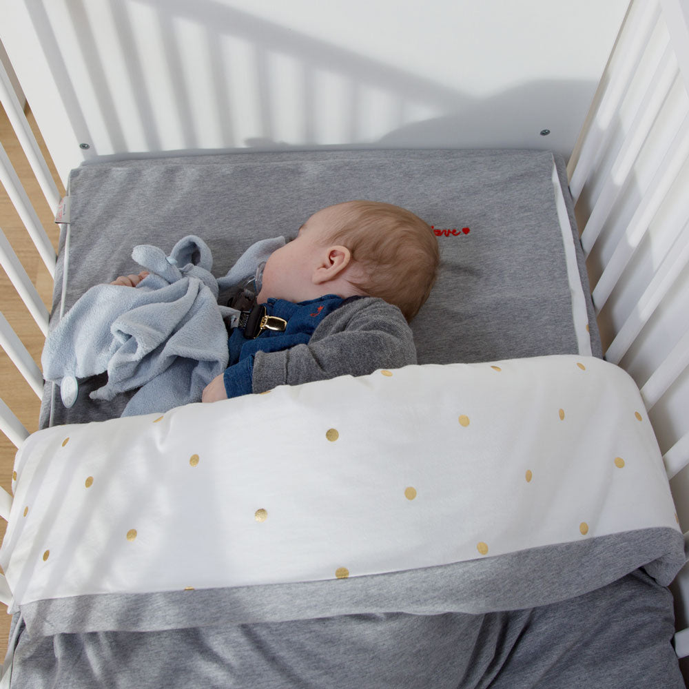 Husa pentru pilota si fata de perna de la Childhome sun confectionate din jerse de inalta calitate si muselina din bumbac si are un imprimeu dragut cu buline aurii. Potrivit pentru patuturi cu dimensiuni de 60 x 120 cm si 70 x 140 cm. Husa pentru pilota are o deschidere mare in partea de jos si inchidere cu capse.