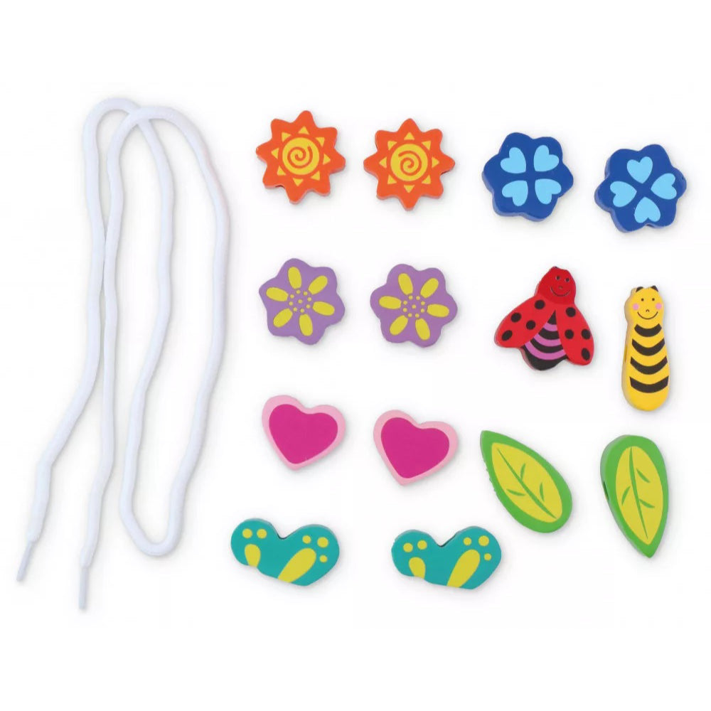 Insira formele colorate pe snur si colierul este gata. Ordinea pieselor face jocul mai captivant, creand povesti si completand micul puzzle albinuta adaugandu-i aripile.