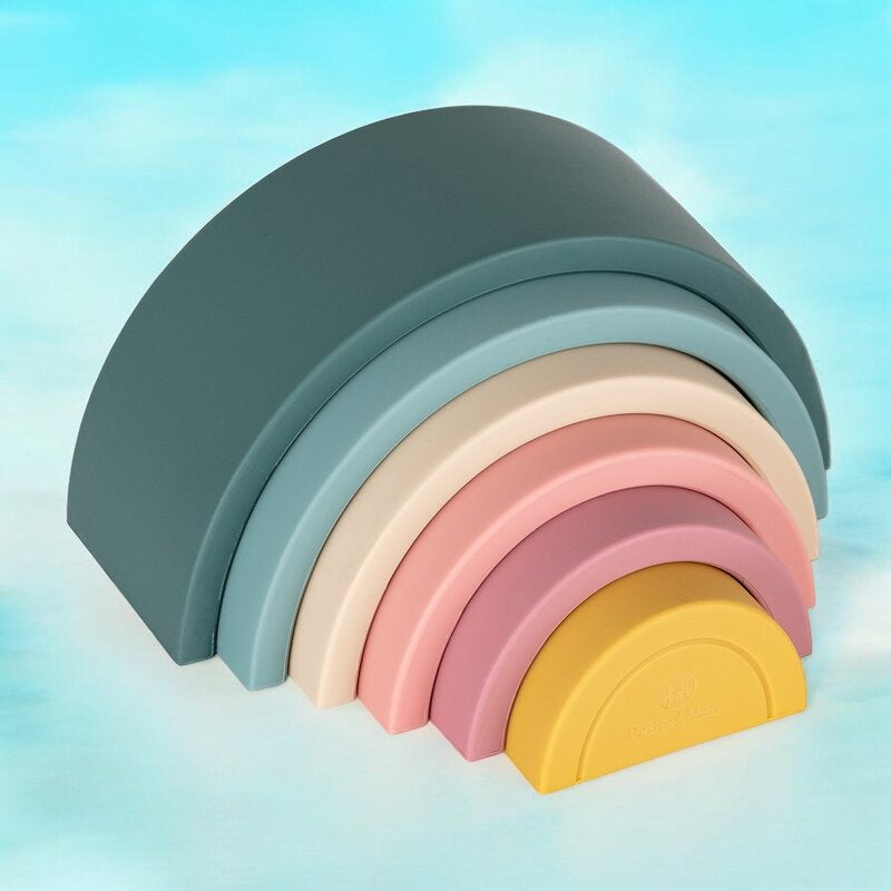 Construieste propria ta curcubeu vesel cu jucaria siliconica RAINBOW ⭐ Setul este format din 6 arcuri colorate care, asezate unul peste altul, formeaza un curcubeu minunat – o adevarata poarta magica spre lumea formelor, culorilor si invatarii.