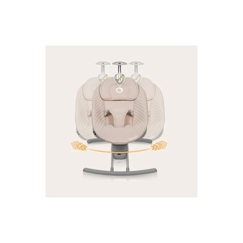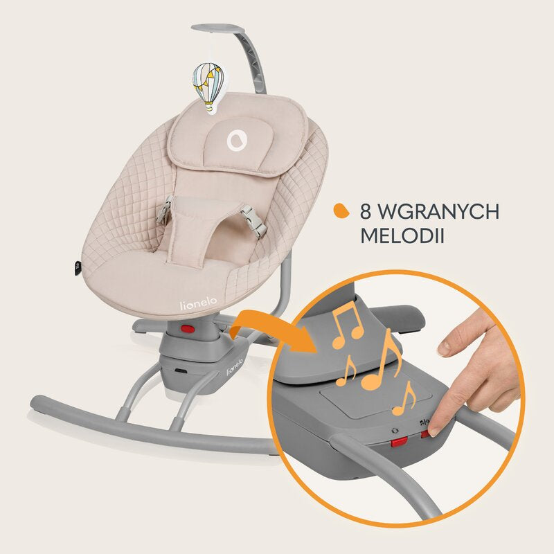 Leagan, Lionelo, Rio, Electric, Cu 3 viteze de leganare, Cu 8 melodii, Cu telecomanda, Cu husa detasabila, Cu perna detasabila, Centura in 3 puncte, Pana la 9 kg, Bej