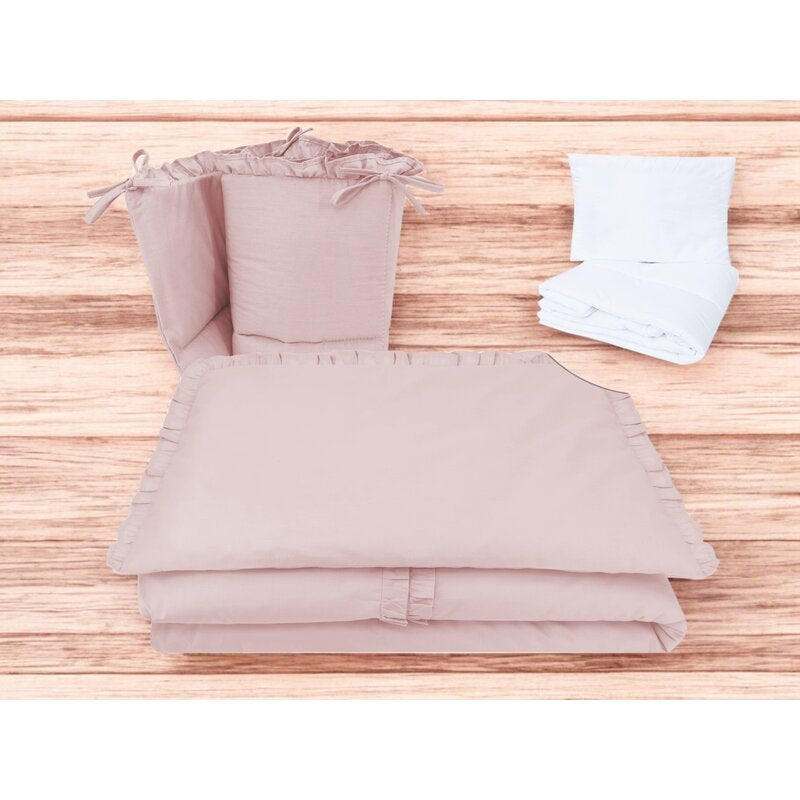 Lenjerie patut cu 5 piese, MimiNu, Pentru patut 120x60 cm, Cu volanase, Cu pilota si perna, Din bumbac certificat Oeko Tex Standard 100, Colectia Royal, Powder Pink