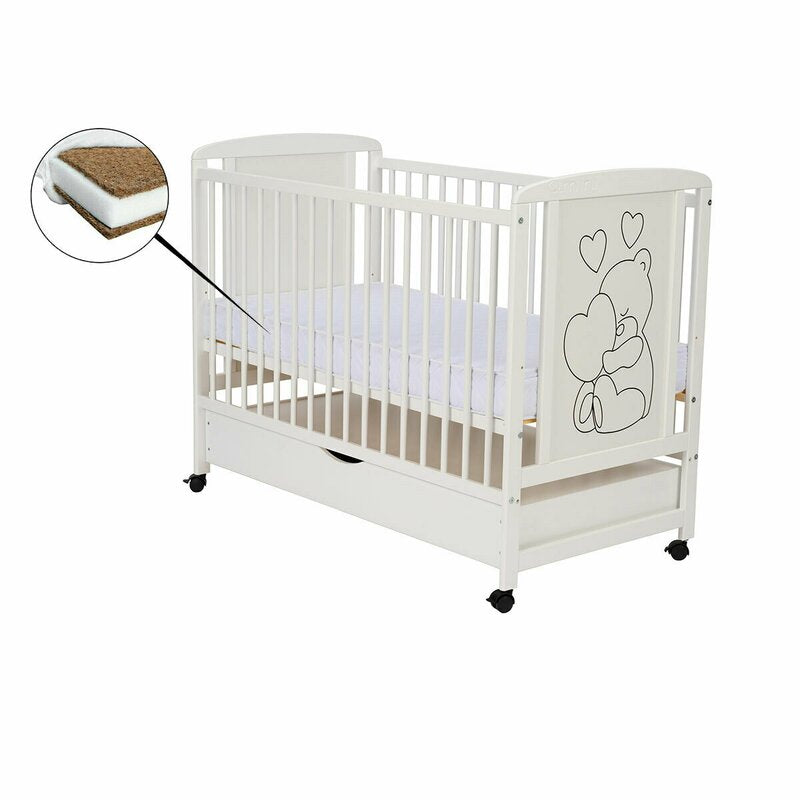 Patut din lemn, 120x60 cm, Cu sertar, Din lemn de pin si mdf, Stabil si rezistent, Inaltime saltea reglabila pe 3 nivele, Laterala cu 3 bete detasabile, EN716-1, EN716-2, Alb, Qmini, Timmi Heart + Saltea 10 cm
