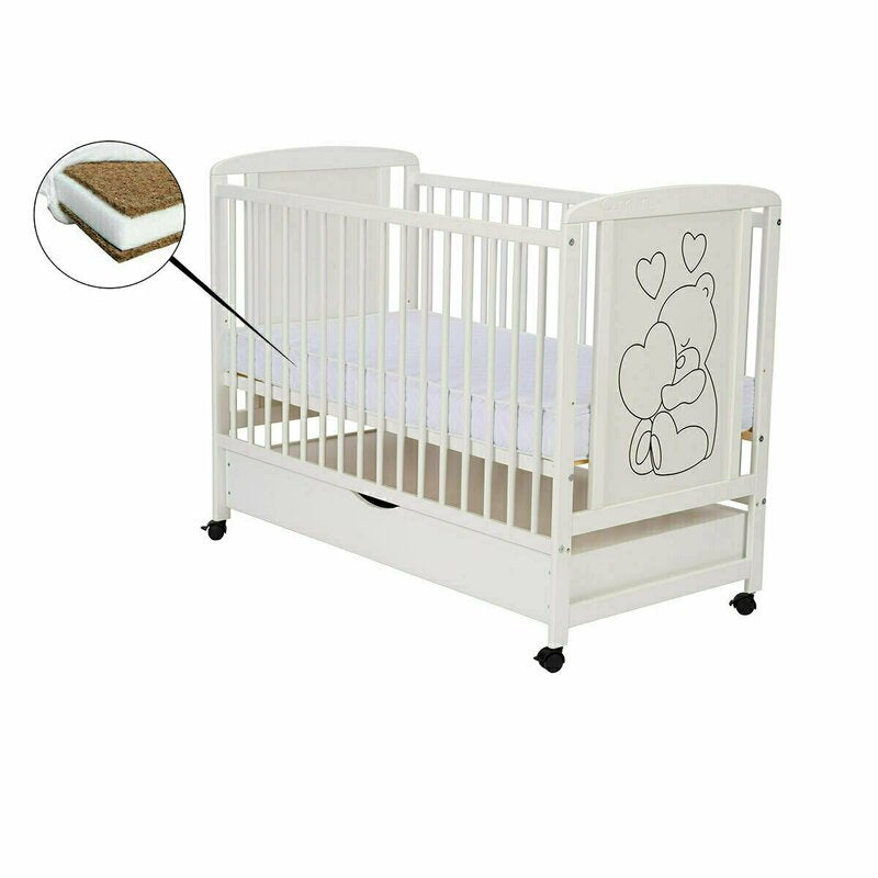 Patut din lemn, 120x60 cm, Cu sertar, Din lemn de pin si mdf, Stabil si rezistent, Inaltime saltea reglabila pe 3 nivele, Laterala cu 3 bete detasabile, EN716-1, EN716-2, Alb, Qmini, Timmi Heart + Saltea 12 cm