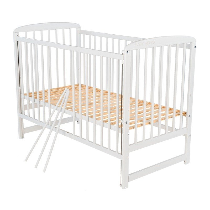 Patut din lemn bebe, 120x60 cm, Cu laterala culisanta, Din lemn de pin, Stabil si rezistent, Inaltime saltea reglabila pe 3 nivele, Laterala cu 3 bete detasabile, EN716-1, EN716-2, Alb, Babyneeds, Ola + Saltea 12 cm