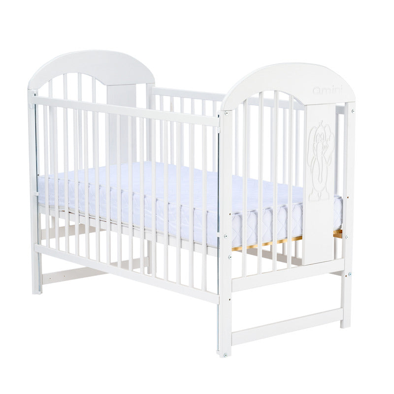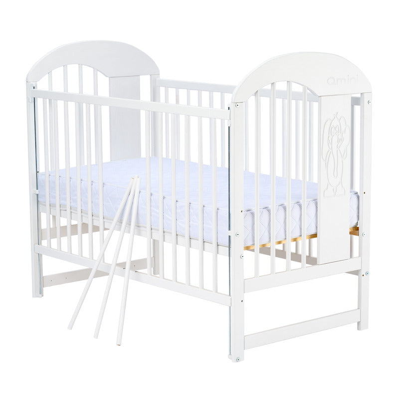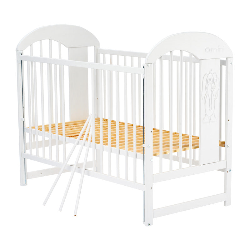 Patut din lemn bebe, 120x60 cm, Cu laterala culisanta, Din lemn de pin, Stabil si rezistent, Inaltime saltea reglabila pe 3 nivele, Laterala cu 3 bete detasabile, EN716-1, EN716-2, Alb, Qmini, Julia II, Elefantel