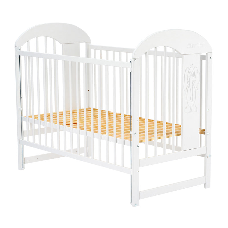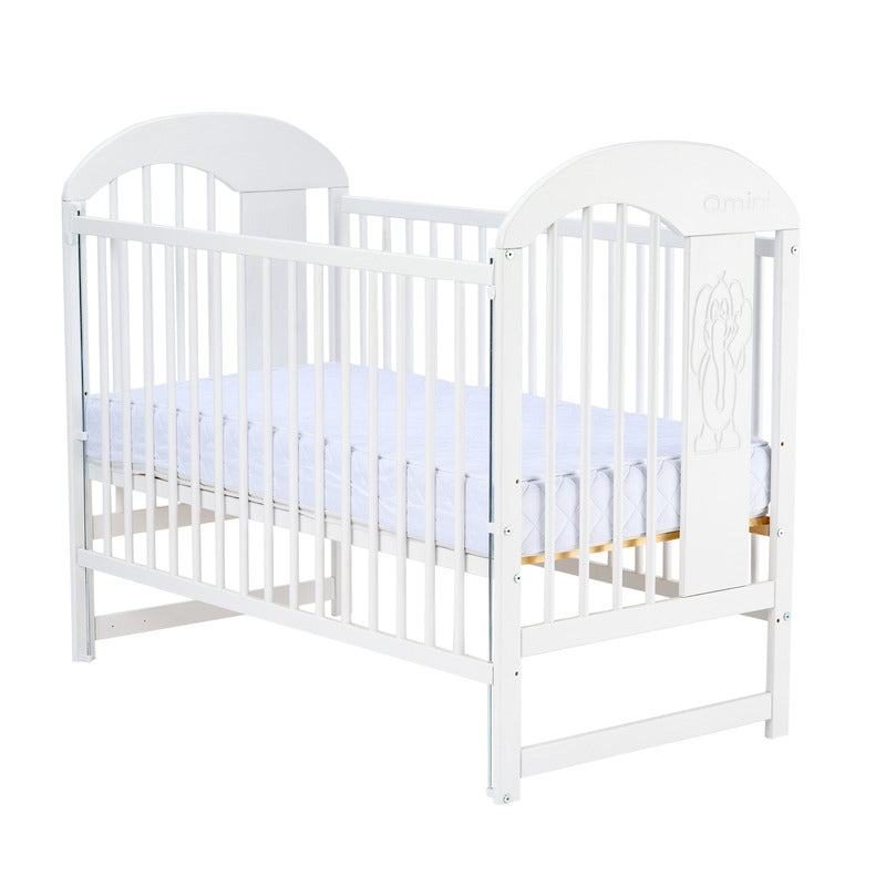 Patut din lemn bebe, 120x60 cm, Cu laterala culisanta, Din lemn de pin, Stabil si rezistent, Inaltime saltea reglabila pe 3 nivele, Laterala cu 3 bete detasabile, EN716-1, EN716-2, Alb, Qmini, Julia II, Elefantel + Saltea 12 cm