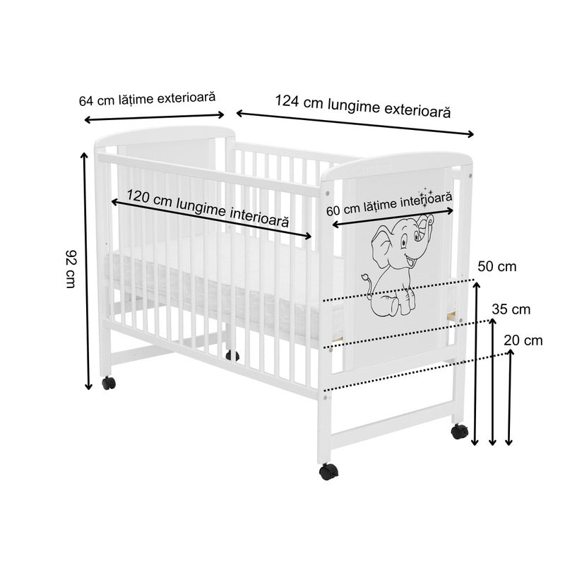 Patut din lemn bebe, 120x60 cm, Din lemn de pin si mdf, Stabil si rezistent, Inaltime saltea reglabila pe 3 nivele, Laterala cu 3 bete detasabile, EN716-1, EN716-2, Alb, Qmini, Timmi Elephant + Saltea 12 cm