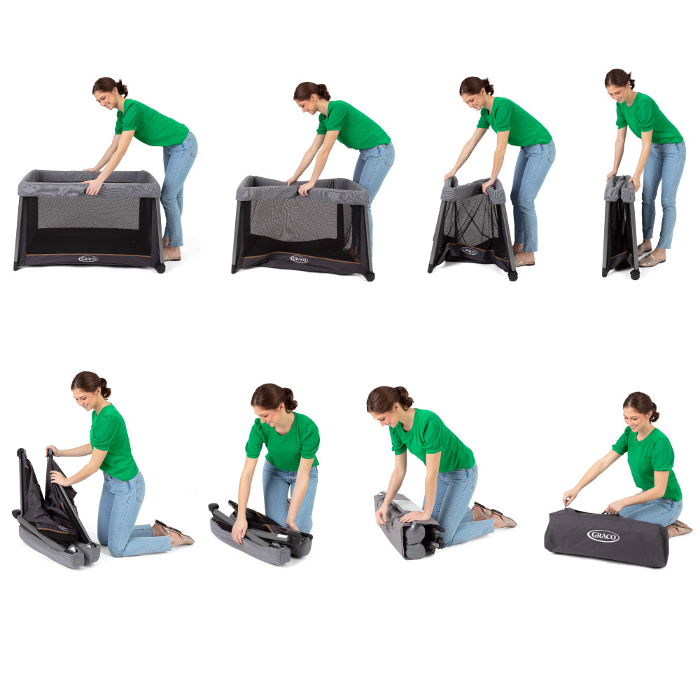 Ceea ce este special la patutul Graco FoldLite este plierea cu doua optiuni. Plierea simpla si rapida este perfecta atunci cand trebuie sa eliberezi spatiul si se deschide in cateva secunde atunci cand sunteti gata sa reveniti la joaca. Plierea compacta ofera portabilitate maxima atunci cand vizitati prietenii si familia.