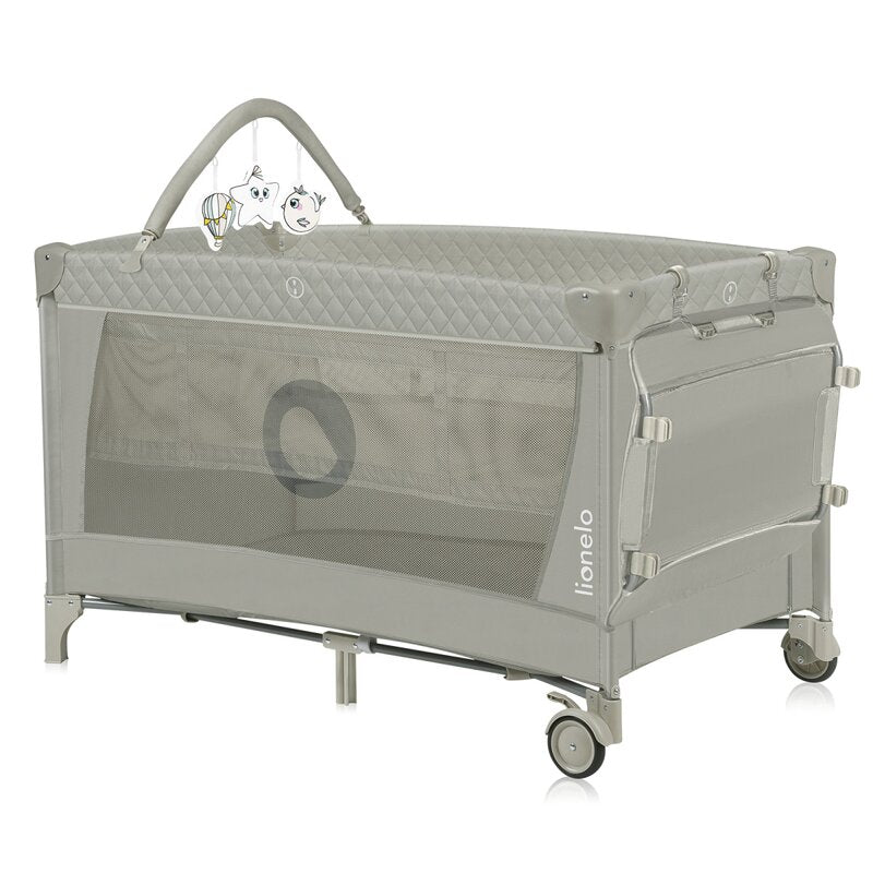 Patut pliant, Lionelo, Flower, Cu doua nivele, Cu arcada, Geanta transport, Masuta de infasat, Bara cu jucarii, Fereastra laterala, 120x60 cm, Conform cu standardele europeane de securitate EN 716 si EN12221, Cappuccino