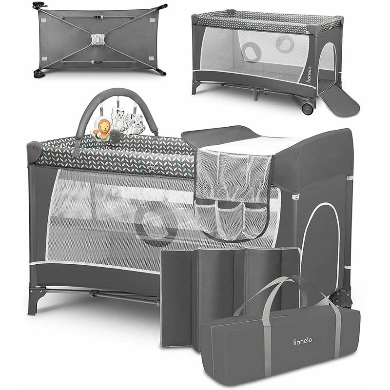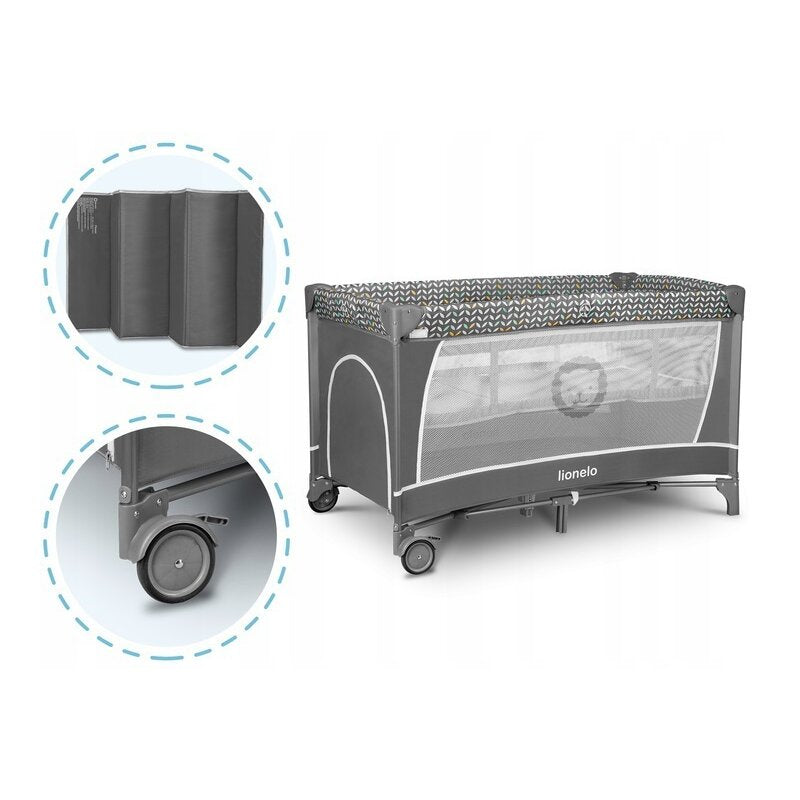 Patut pliant, Lionelo, Flower, Cu doua nivele, Cu arcada, Geanta transport, Masuta de infasat, Bara cu jucarii, Fereastra laterala, 120x60 cm, Conform cu standardele europeane de securitate EN 716 si EN12221, Gri