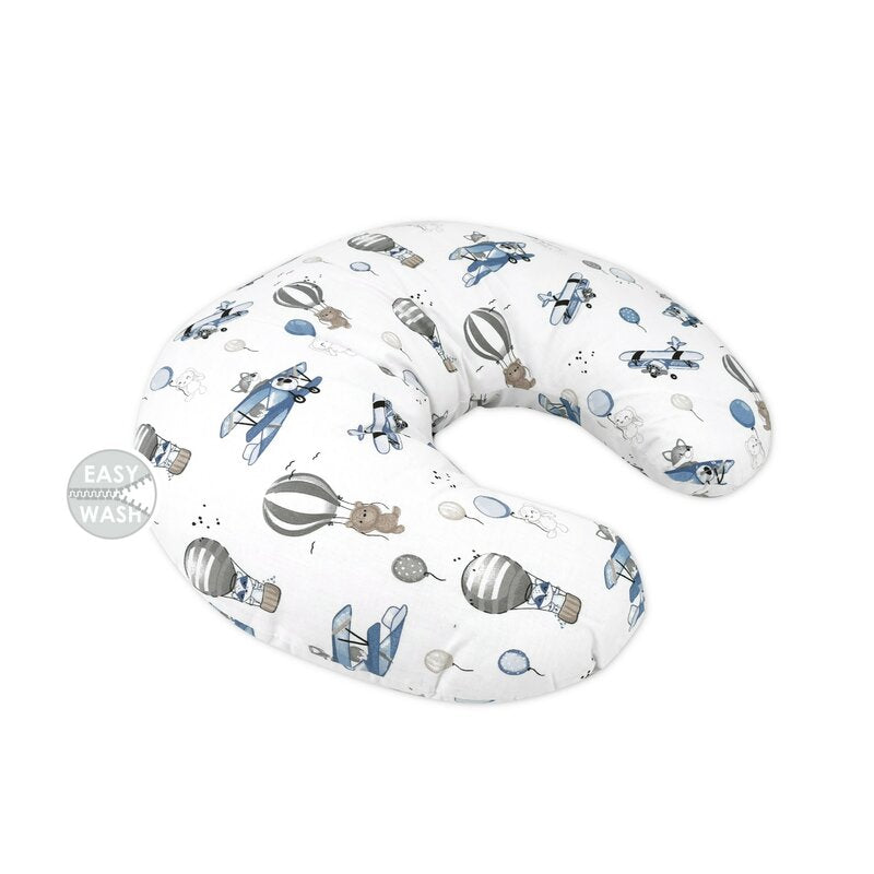 Perna pentru alaptat, MimiNu, Din bumbac certificat Oeko Tex Standard 100, Cu husa detasabila, Cu fermoar securizat, Circumferinta 155 cm, Blue Plane