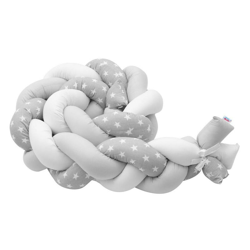 Protectie laterala, New Baby, Pentru patut, Tip Bumper impletit, Din bumbac, Din materiale certificate Oeko Tex Standard 100, Lungime 225 cm, Stars grey/white