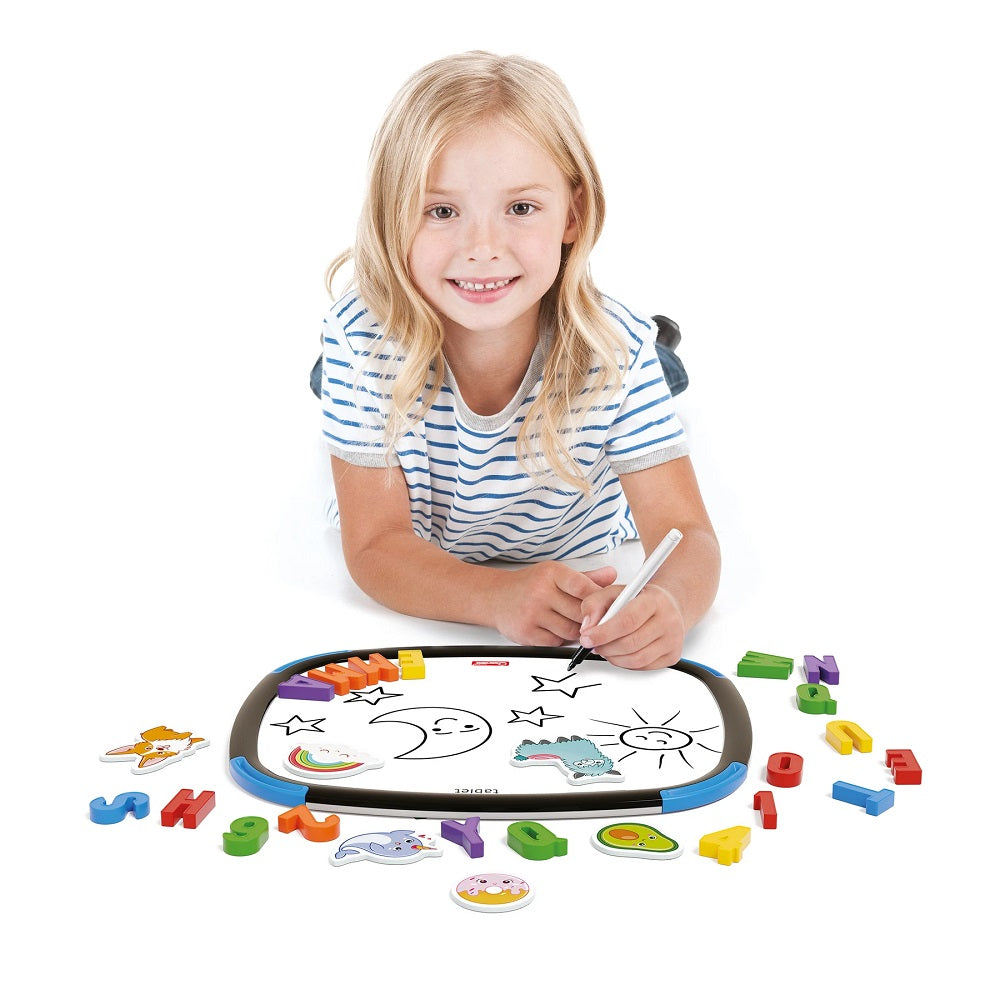 Iata noua linie de tablete magnetice cu doua fete de la Quercetti, cu forma rotunda originala. Marginile netede sunt protejate cu insertii colorate din cauciuc rezistent la socuri, un joc complet sigur pentru copii.' Utilizati ambele parti ale tabletei, fie folosind literele si cifrele magnetice, fie desenand si scriind cu markerul.' Setul include o selectie de ilustratii magnetice din carton robust, concepute special pentru a incuraja ortografia unor cuvinte usoare intr-un mod distractiv.' In plus, un accesoriu util poate fi fixat pe rama pentru a pastra intotdeauna radiera si markerul la indemana iar cele doua suporturi permit plasarea tabletei atat pe verticala, cat si pe orizontala.
