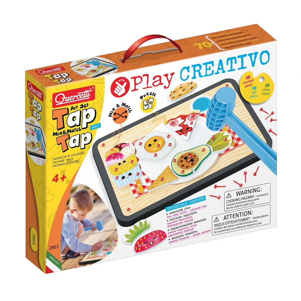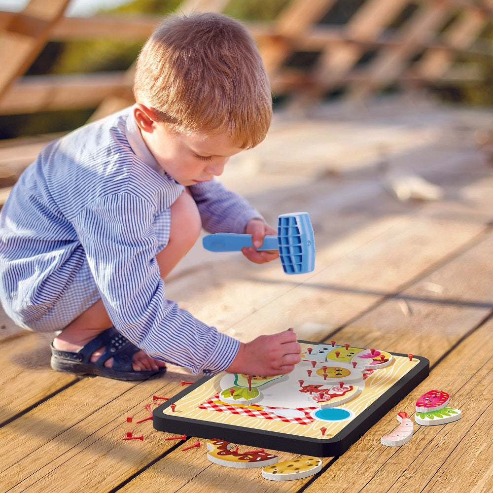 Folosind cuie speciale si un ciocan solid din plastic, cele 36 de placi ilustrate pot fi fixate, reasambland diferite alimente sau inventand altele noi. Cuiele din plastic create exclusiv de producatorul italian Quercetti, fixeaza placile din material moale Eva pe toata suprafata.