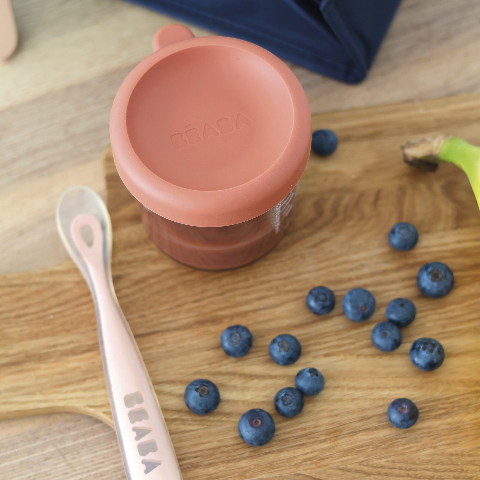 Recipient ermetic sticla Beaba 150 ml Terracotta este companionul ideal pentru mesele bebelusului, oferind siguranta, functionalitate si un strop de culoare.