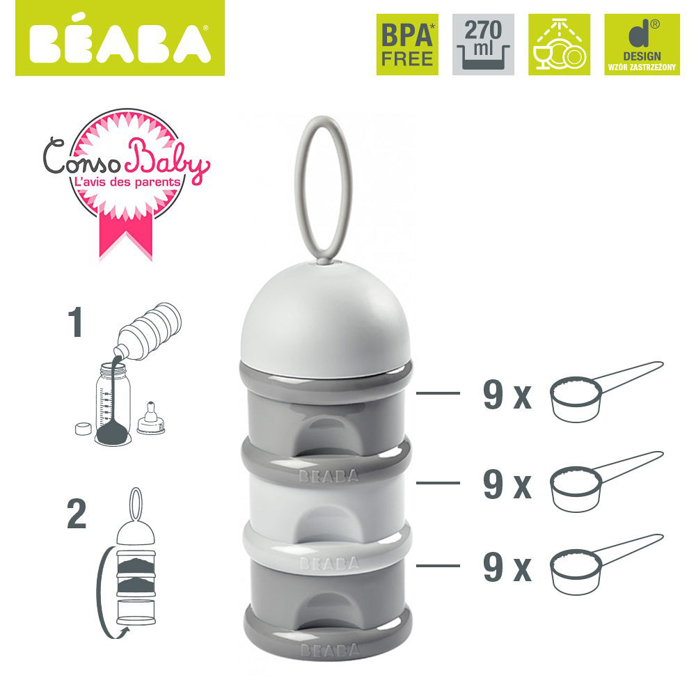 Cu recipientul de lapte praf Beaba puteti economisi timp, pregatindu-va in prealabil dozele de lapte. Este 100% etans, include 3 compartimente care contin pana la 9 doze fiecare. Cand copilul tau creste, poate fi folosi ca recipient pentru gustari.