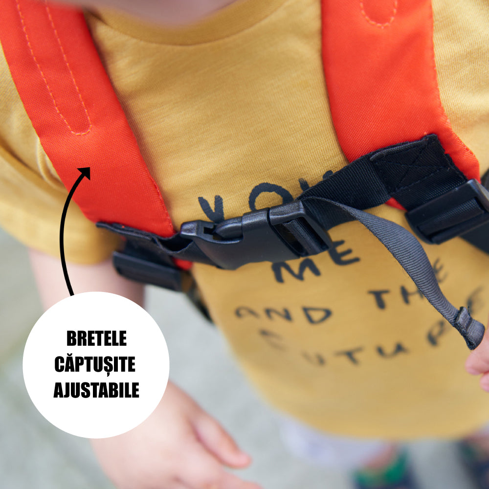 - Utilizare: Ajustați bretelele rucsacului la înălțimea copilului și atașați cureaua de siguranță când este necesar