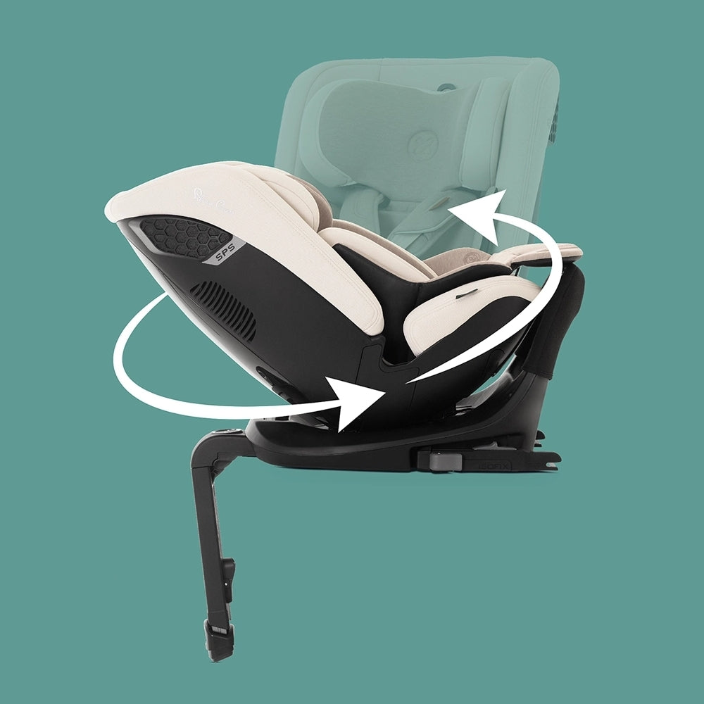 Functia de rotatie la 360'° asigura o utilizare simplificata, permitand pozitia cu spatele la sensul de mers pentru o perioada extinsa si o imbarcare laterala rapida. Aceasta functie faciliteaza plasarea si ridicarea copilului din scaun, fara efort. Scaunul poate fi utilizat cu spatele la sensul de mers pana la 18 kg sau aproximativ 4 ani, pentru siguranta maxima.