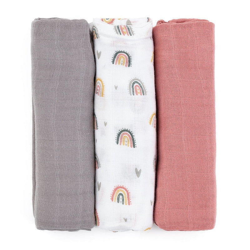 Set 3 scutece, Petite&Mars, Moussy Rose Rainbow, Din muselina de bambus, Hipoalergenice, 68 x 68 cm, Certificate Oeko Tex Standard 100, Multicolor